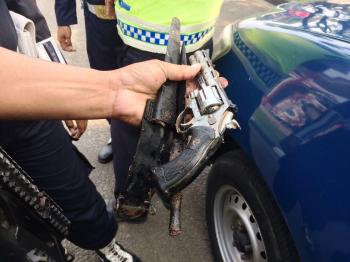 Korek gas tersebut berbentuk senjat api jenis revolver. Petugas juga menemukan satu sangkur di lokasi sekitar.