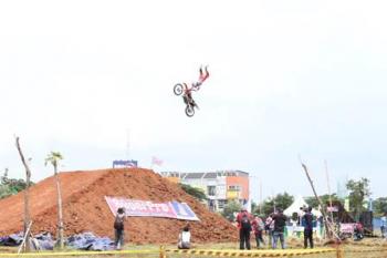 Freestyler yang dikenal dengan nama panggung Frog FMX tersebut terbang dan 'menari-nari' di udara sebelum mendarat di sebuah gundukan tanah buatan. Salah satu aksi yang mencengangkan adalah backflip.