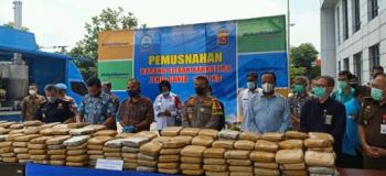SERANG, (JT) - Badan Narkotika Nasional Provinsi (BNNP) Banten musnahkan ganja seberat 301 kilogram, Rabu (21/10/2020). Ganja sebanyak 301 kilogram dari Aceh itu diselundupkan melalui pelabuhan Bojonegara, Kabupaten Serang, Banten.