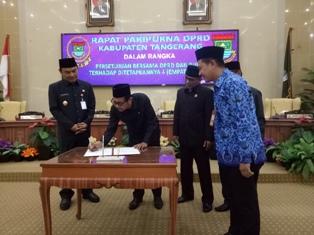 Setelah melalaui pandangan umum seluruh fraksi dan Pandangan Komisi di DPRD Kabupaten Tangerang menyetujui Empat Raperda menjadi Perda dilanjutkan penandatangannan antara DPRD dan Wakil Bupati Tangerang.