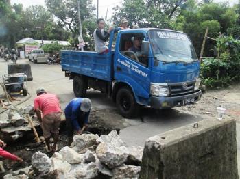 Pantauan di lokasi, tim dari Dinas Pekerjaan Umum melakukan pengangkatan beton-beton yang rusak. Aspal yang hancur pun dikelupaskan untuk nantinya diaspal ulang.