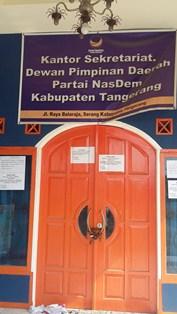 Pantauan di lokasi, kantor DPD Partai Nasdem di Jalan Raya Serang, Desa Cibadak, Kecamatan Cikupa Tangerang itu masih lengkap dengan atribut partai. Sementara pintu utama rumah berukuran lebih dari 7x10 itu terlihat dipasang rantai dan digembok dengan sejumlah tulisan. "Mohon Maaf Rumah ini segel/dikosongkan, tidak boleh digunakan untuk keperluan apapunsebelum perjanjian pelunasan diselesaikan. Terima kasih". Harap Hubungi 1. H. Nasrudin 2. H. Daud Hanapi. Di lembar lain juga terdapat tulisan "Pemberitahuan Mohon Maaf Rumah ini sementara tidak boleh dipergunakan untuk kegiatan apapun. karena belum luas kepada pemiliknya".