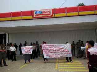 Pantauan di lapangan puluhan massa datang pada sekitar 10.00 WIB dengan berjalan kaki. Mereka membawa poster yang berisi tuntutan penutupan toko retail Alfamart. Selain itu warga mengaku keberadaan toko modern ini penghasilan pedagang kecil dan eceran menurun drastis.