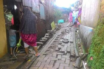 RANGKASBITUNG - Curah hujan kembali meninggi, warga bantaran kali ciujung kembali resah. Hujan lebat beserta petir yang menerjang sejak pukul 02.00 WIB hingga menjelang siang hari, selasa (21/2) membuat kontur tanah di bantaran kali dan jalan lingkungan mengalami penurunan hingga 40 Cm.