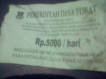 Dugaan kuat setoran itu, dibuktikan dengan ditemukannya karcis pungli oleh mantri pasar Sentiong beberapa waktu lalu. Karcis retribusi yang mengatasnamakan Pemerintahan Desa Tobat ini diperlihatkan oleh mantri pasar Sentiong kepada awak media. Karcis berukuran kecil berwarna hijau ini mematok PKL sebesar Rp 5000 per hari.