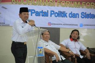 TANGERANG - Wakil Walikota Tangerang, Sachrudin berikan arahan saat menutup acara Kordinasi Forum-Forum Diskusi Politik yang diselenggarakan oleh Kantor Kesatuan Bangsa dan Politik (Kesbangpol) Kota Tangerang di gedung KNPI Kota Tangerang, Rabu (27/3/2019).