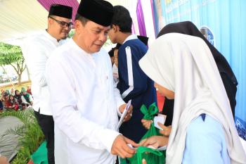 Sekda mengucapkan rasa syukur dan bahagianya bisa bersilahturahmi sekaligus berbagi dengan anak yatim dan masyarakat Kelurahan Medang.