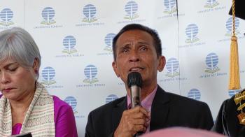 "Terima kasih, yang pertama mari kita panjatkan puji syukur kehadiran Tuhan yang Maha Kuasa, kita boleh bertemu pada saat ini dalam keadaan sehat terlebih kami mengucapkan syukur atas nama keluarga besar kami, mengucapkan terima kasih kepada Rektor UT, wakil rektor UT, ketua dan seluruh anggota senat UT, dan dirut UT Provinsi Jambi. Kami sangat mengapresiasi dan mengucapkan terima kasih, atas perhatian dan bantuan yang telah diberikan kepada kami Keluarga, yang telah memfasilitasi kami atas diwisudanya, anak kita, alm Yosua, yang telah menyelesaikan studinya sebelum meninggal dunia," jelasnya. (HAN)