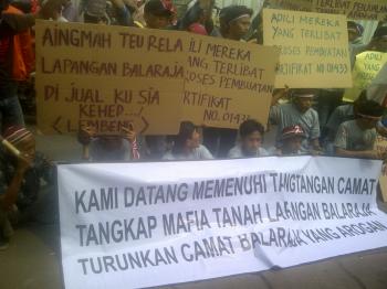 Koordinator Aksi Erwin mengatakan, kedatangan ratusan mempertanyakan penjualan aset lapangan Balaraja. Proses penjualan lahan seluas 7.026 meter persegi ini seharusnya batal demi hukum. Karena lahan tersebut sarat dengan rekayasa."Kami meminta agara Camat Balaraja mundur dari jabatannya dan harus bertanggung kawab atas penjualan aset negara,"ujarnya. (day)