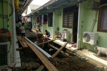 Saat ini, sejumlah pekerja dari pemilik kontrakan tengah melakukan pekerjaan untuk memperbaiki kondisi tanah yang amblas itu.