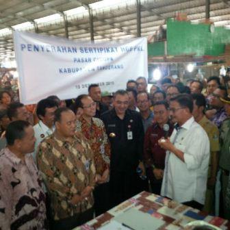 CIKUPA - Bupati Tangerang Ahmad Zaki Iskandar mendampingi Menteri Agraria dan Tata Ruang (ATR) Ferry Mursyidan Baldan, kunjungi pasar Cikupa, Selasa (15/12/2015). Dalam kesempatan ini Menteri memberikan sertifikat Hak Guna Bangun (HGB) kepada para pedagang kaki lima (PKL).